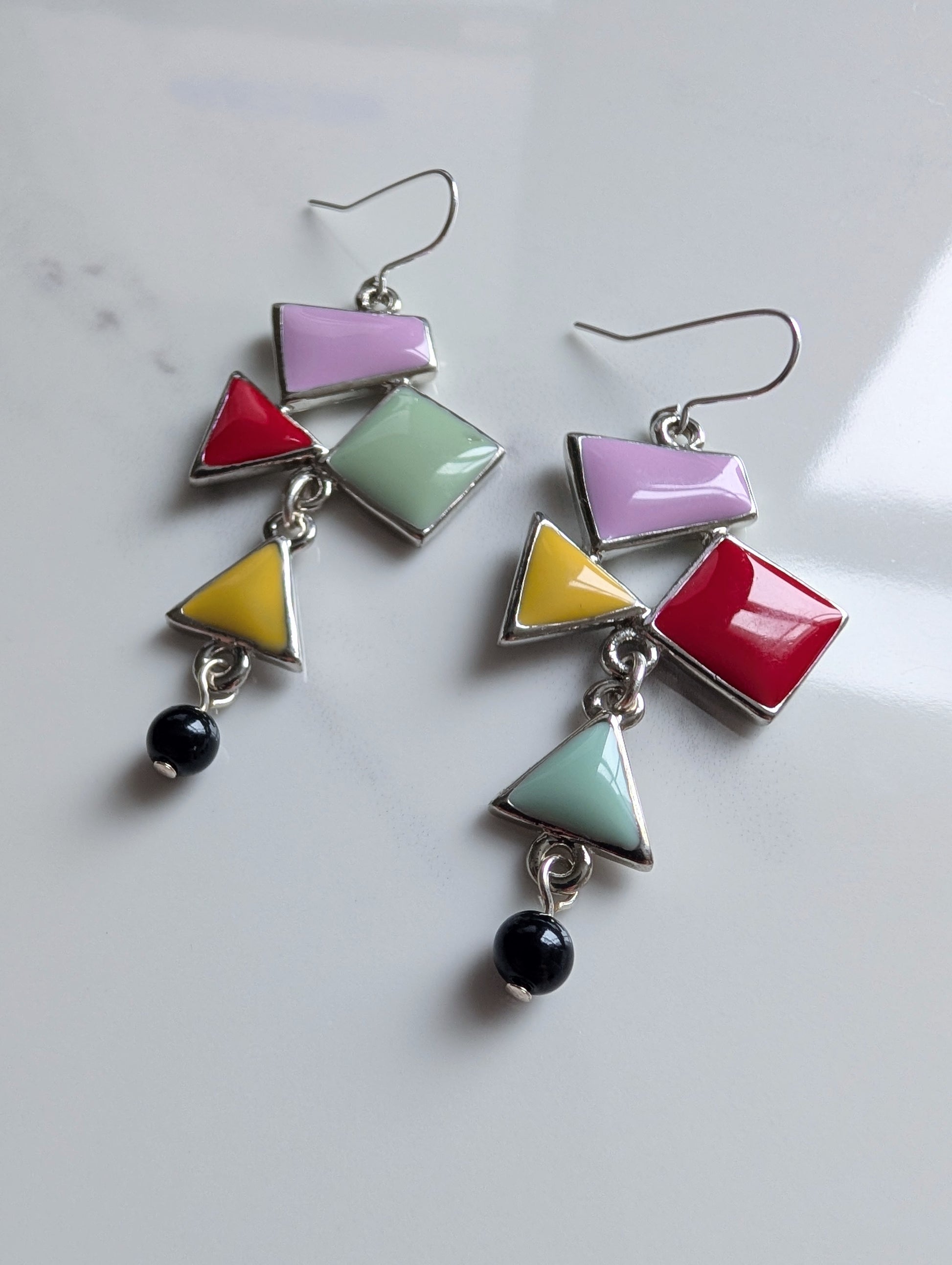 Bold colourful earrings with abstract pink, yellow, red and green enamelled shapes and a vintage black bead charm, with new silver plated earring posts.