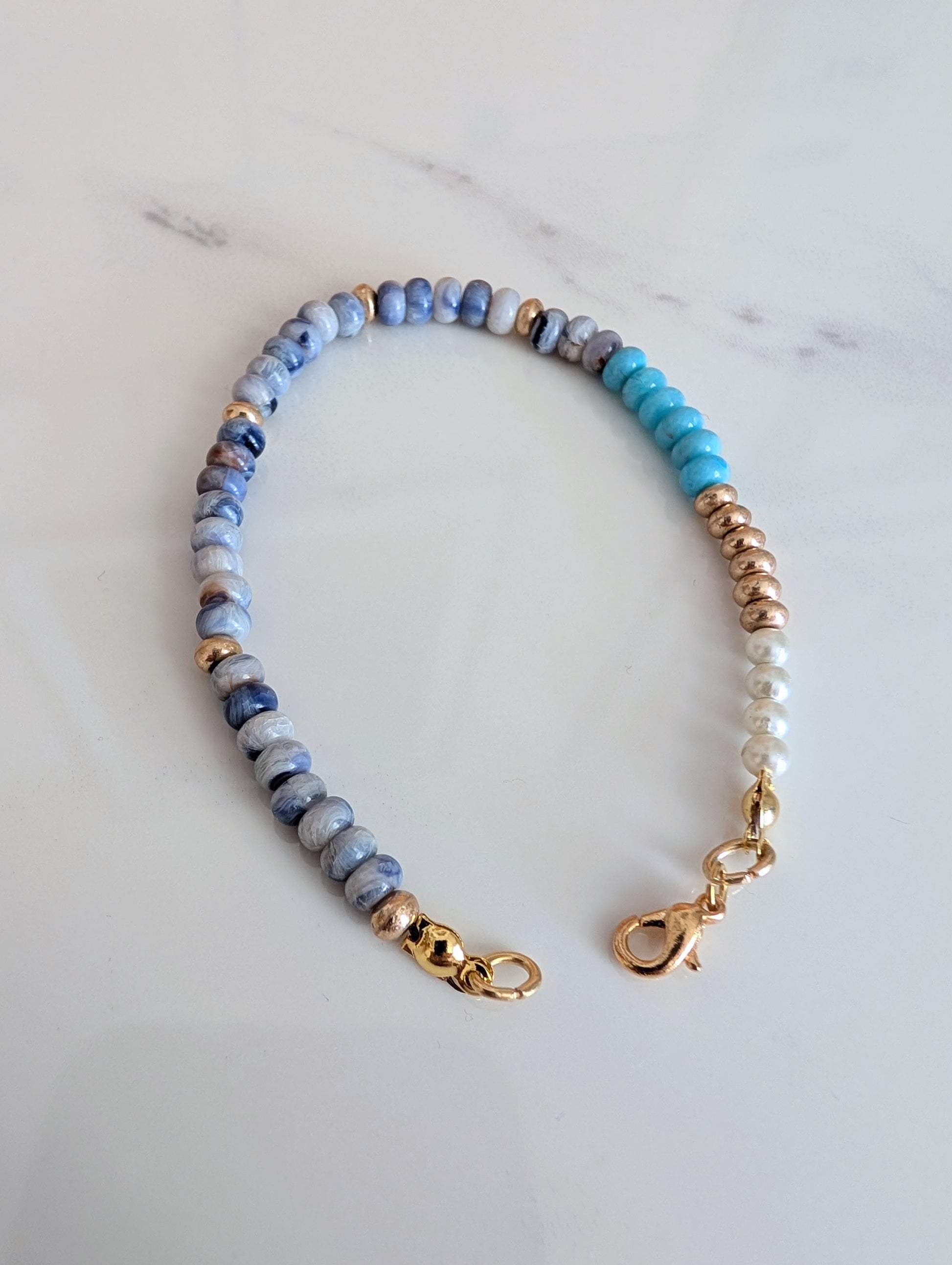 Beaded bracelet made with blue marbled, turquoise, gold tone and pearl love beads with a new gold-plated lobster clasp.