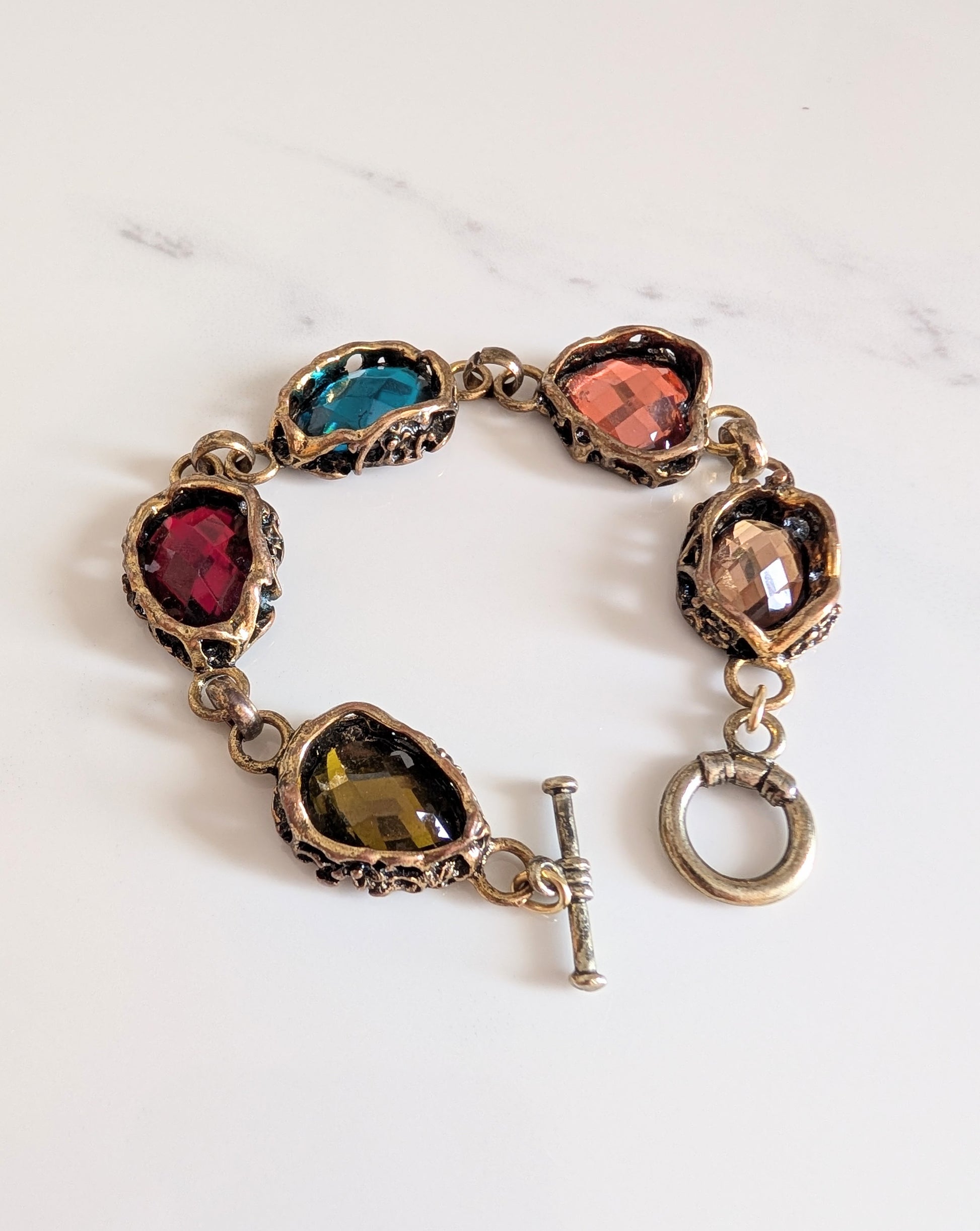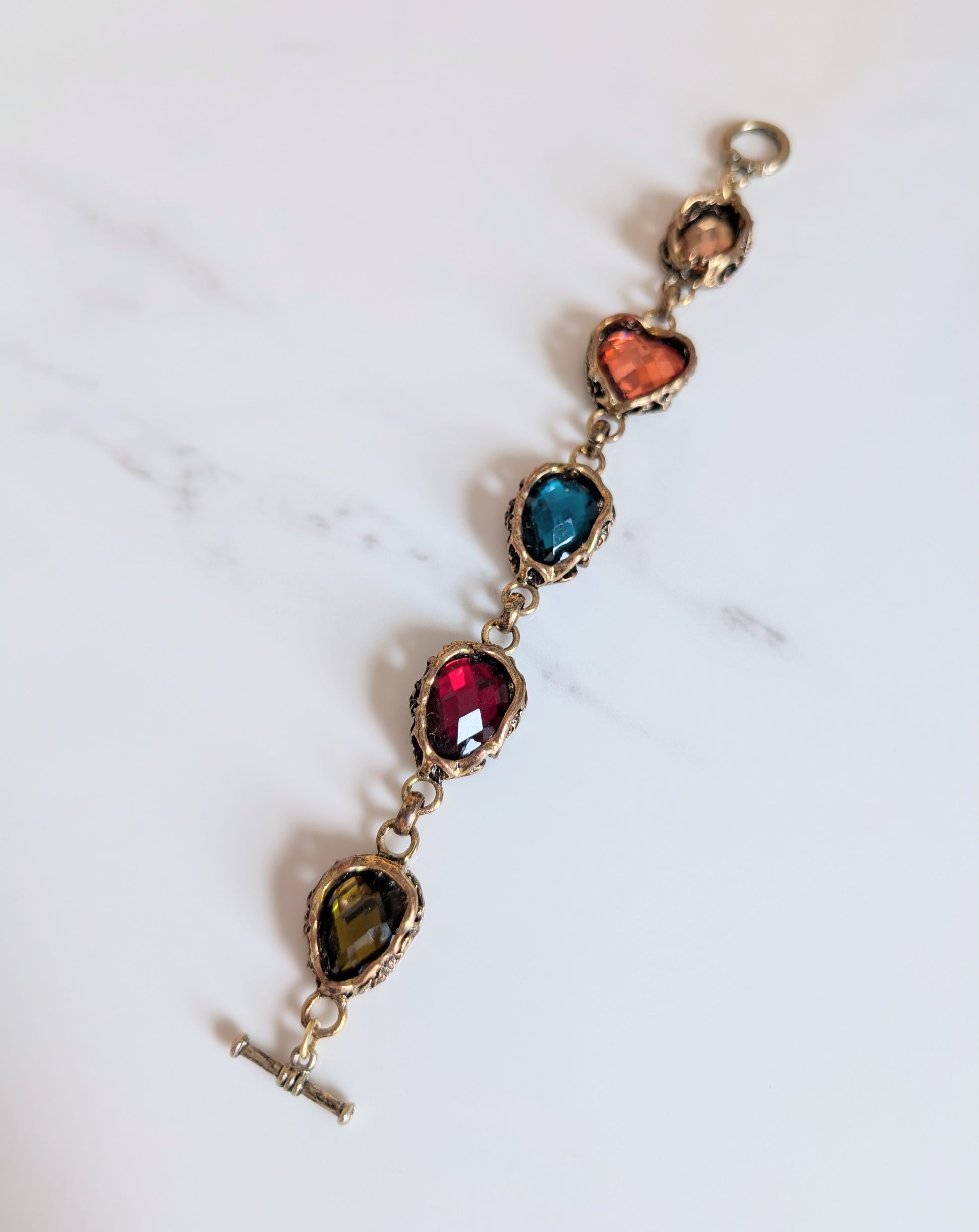 Beautiful gold tone bracelet with red, blue, orange and yellow faceted jewels set in mirrored casings, and a vintage gold tone plated ring and bar fastening.
