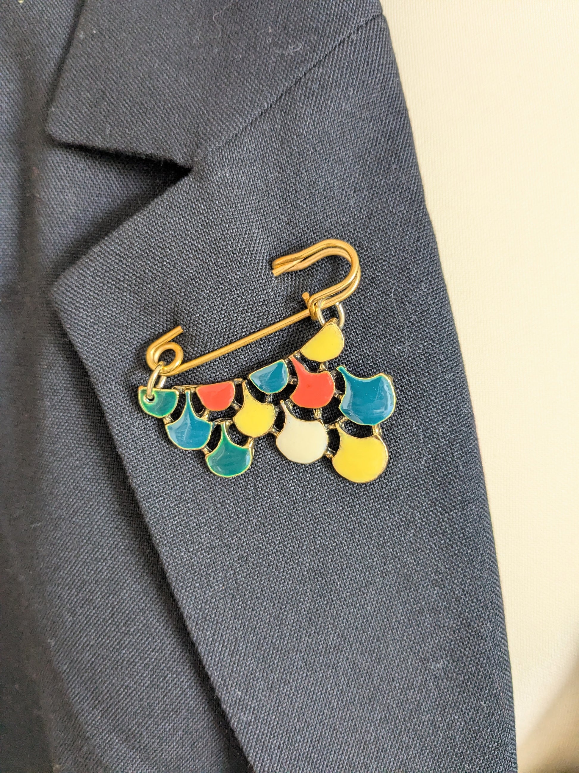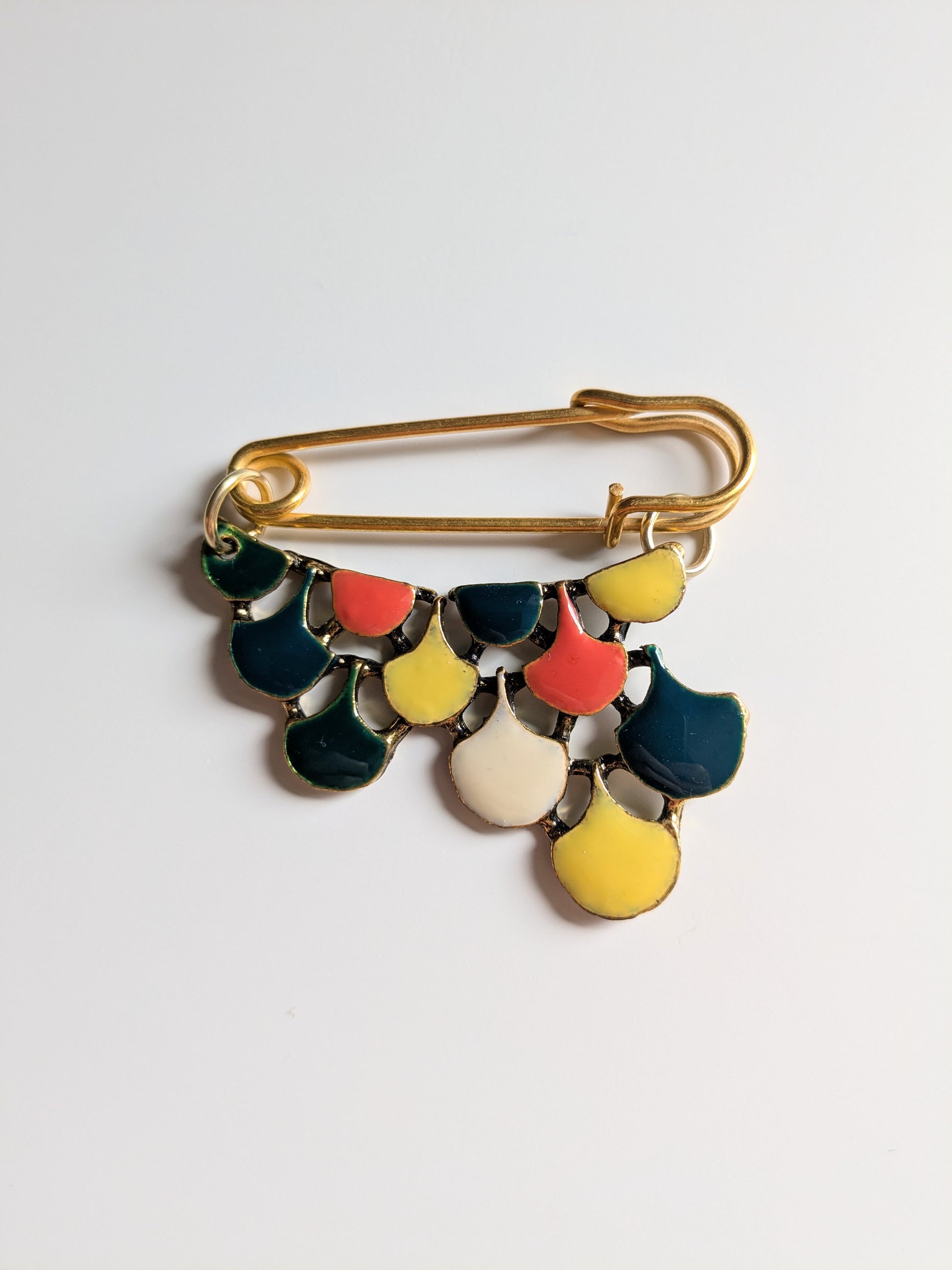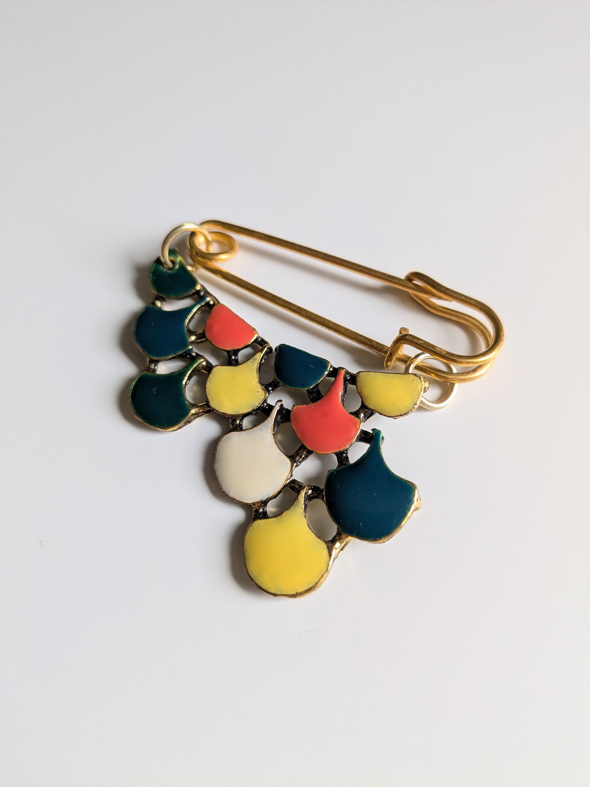 Statement brooch made with a petrol blue, orange, yellow and off-white linked charm, on a new gold tone stainless steel kilt pin.