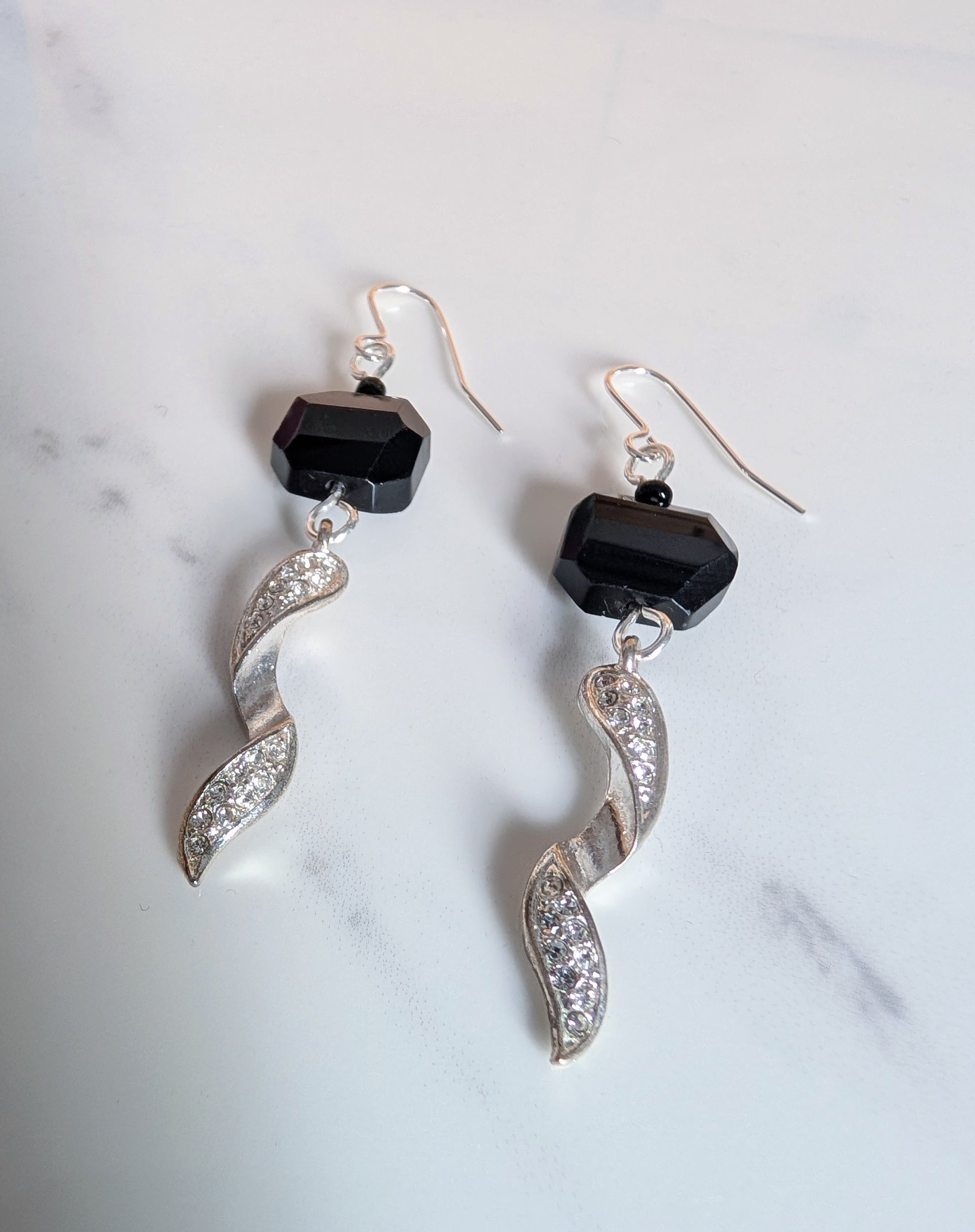 Beautiful elegant earrings made with geometric black glass beads and vintage silver tone jewelled twist charms, with new silver-plated wires.