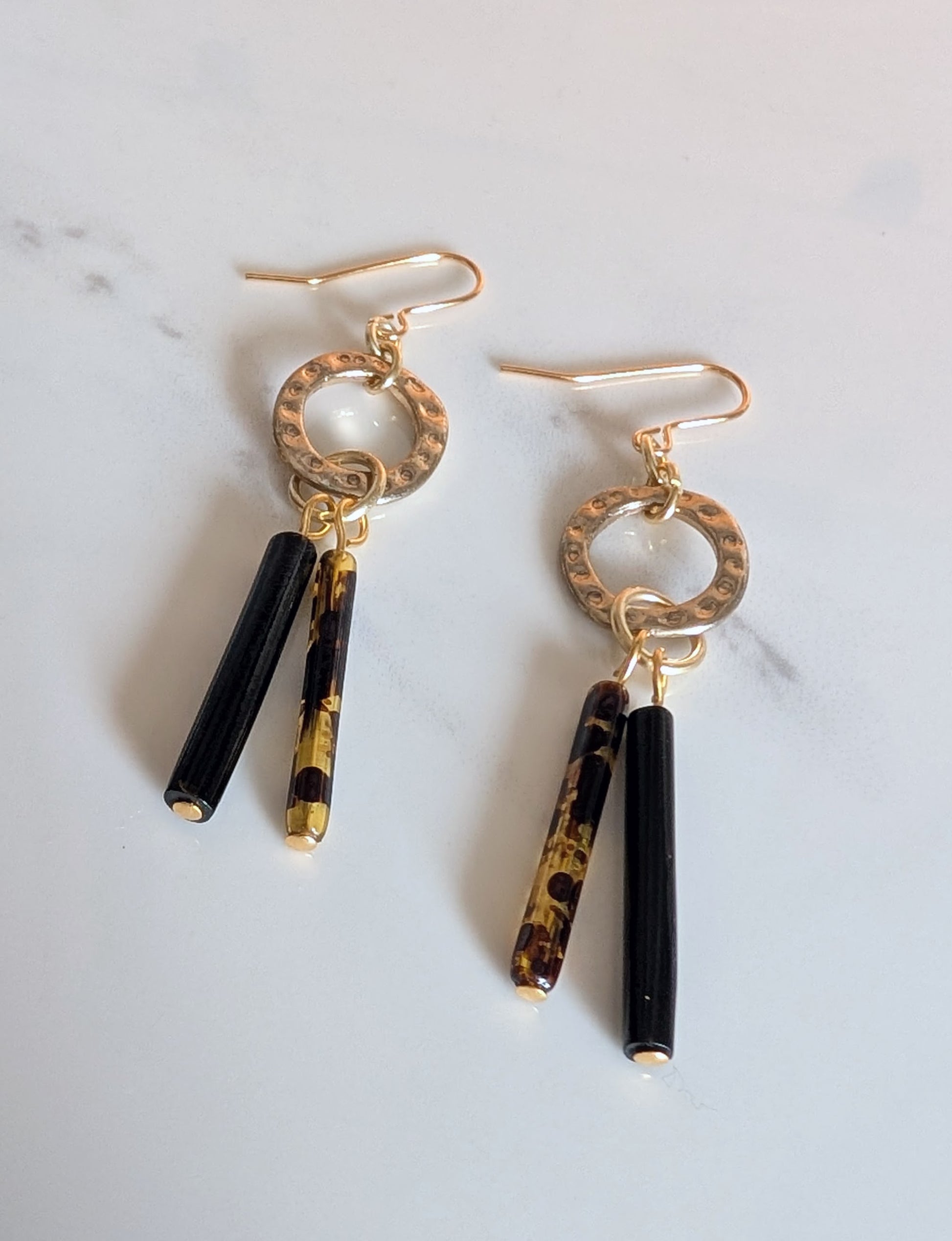 Eye-catching and lightweight drop earrings, made with hammered brass rings, black and tortoiseshell plastic bead charms, and new gold-plated wires.
