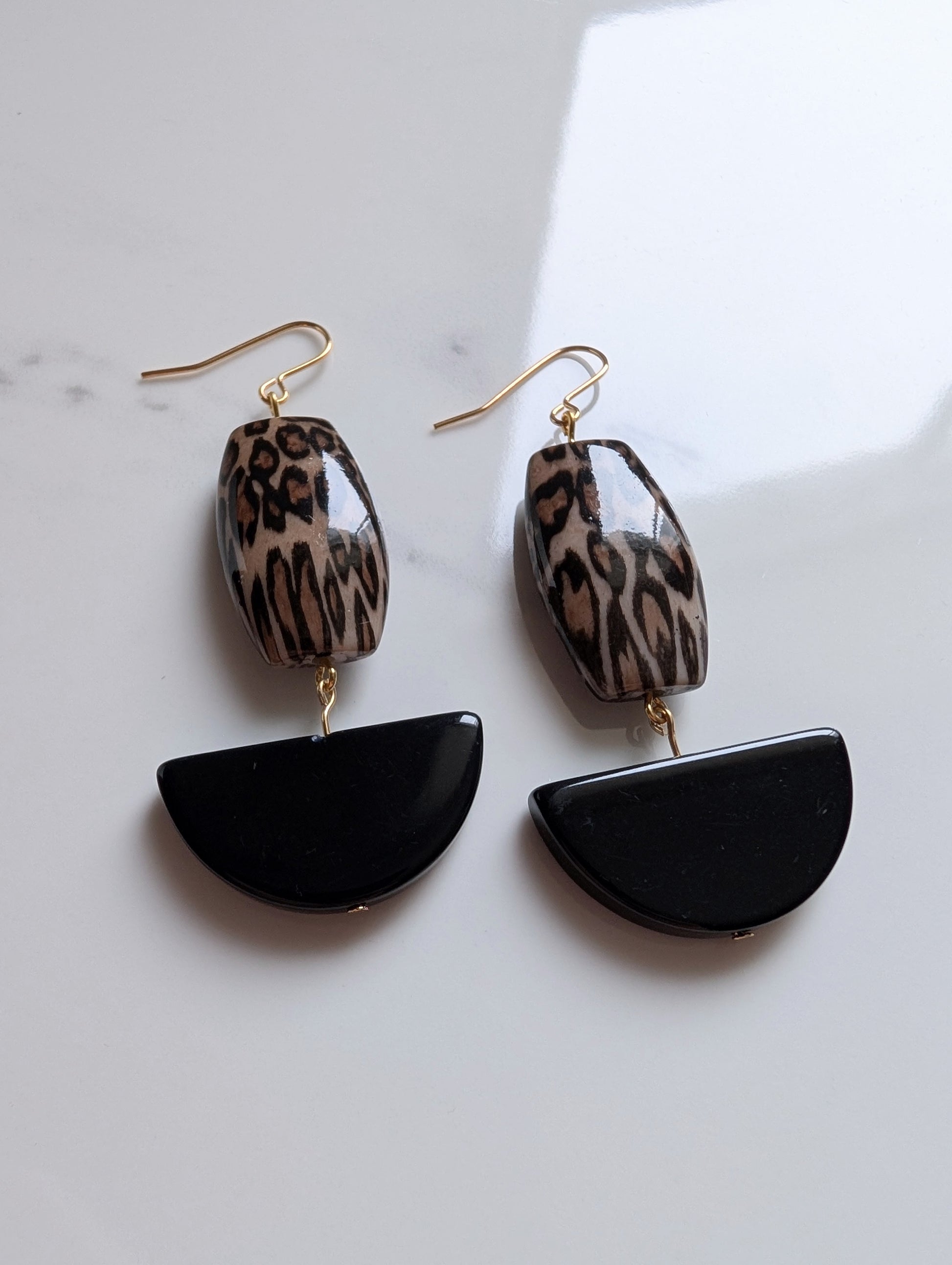 Striking geometric earrings, featuring an eye-catching mix of chunky square and semi-circular beads in leopard print and black. Finished with new gold-plated wires.