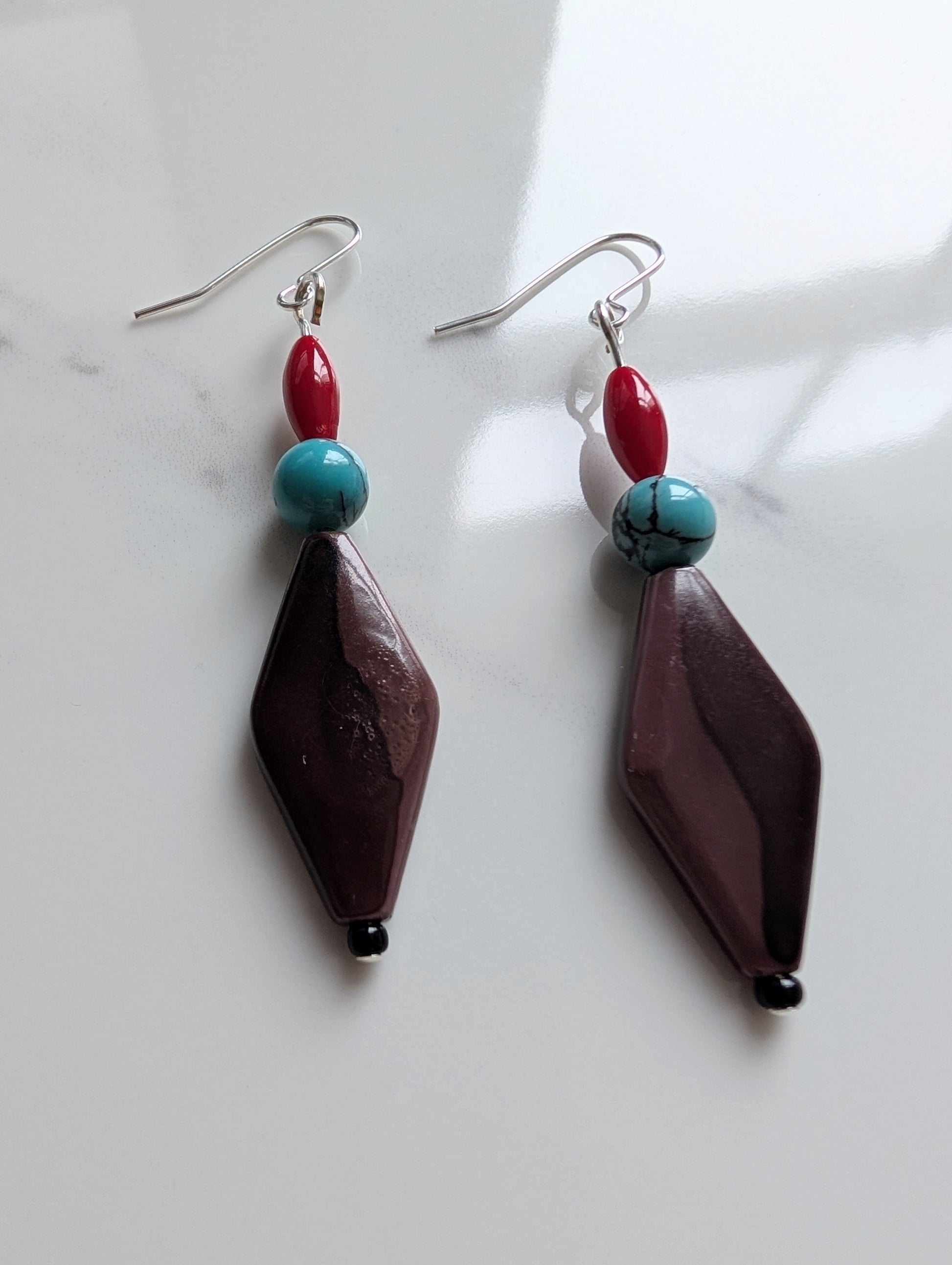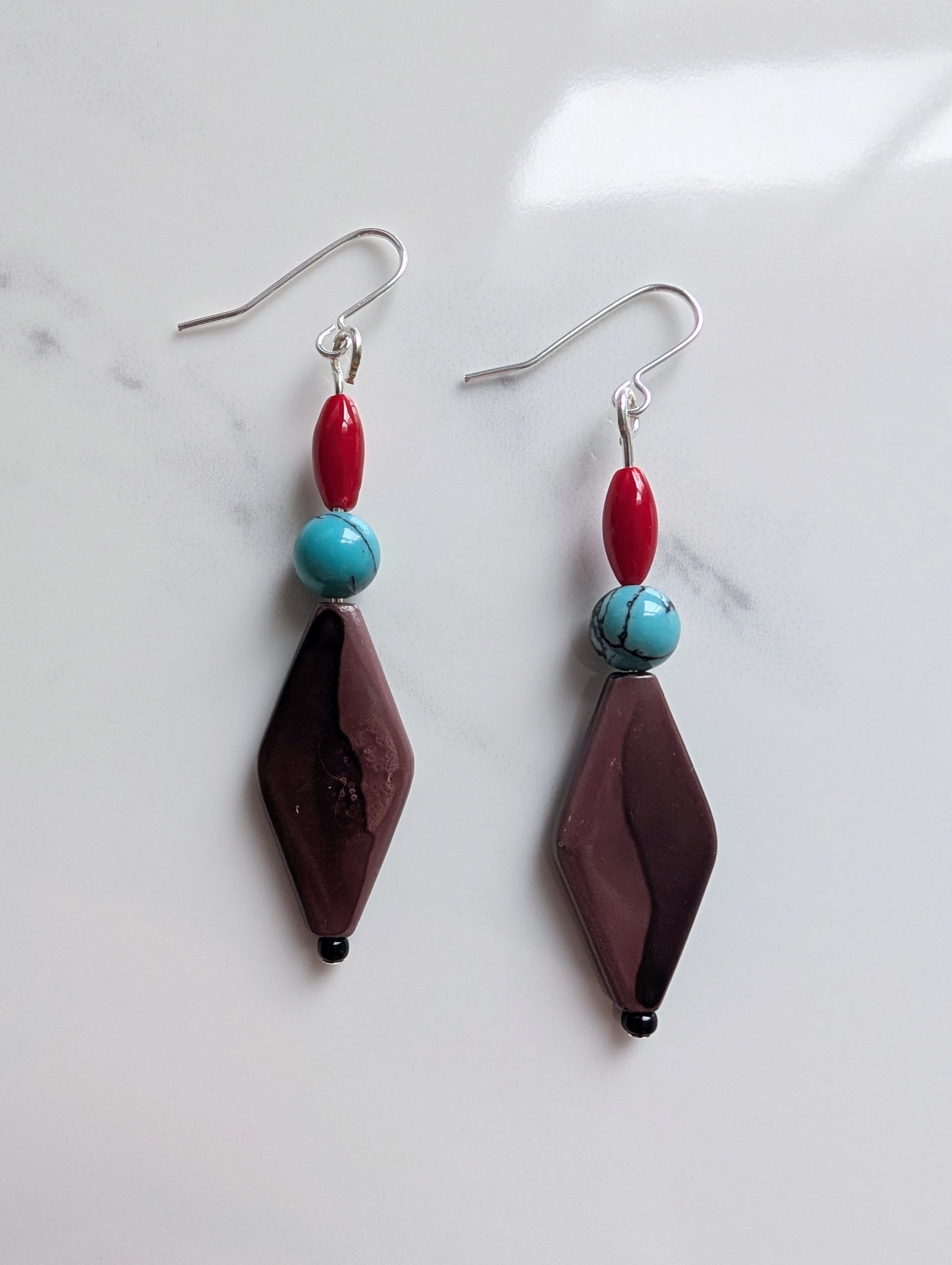 Lightweight earrings made with vintage brown diamond-shaped beads and plastic turquoise and red beads, with new silver plated earring posts.