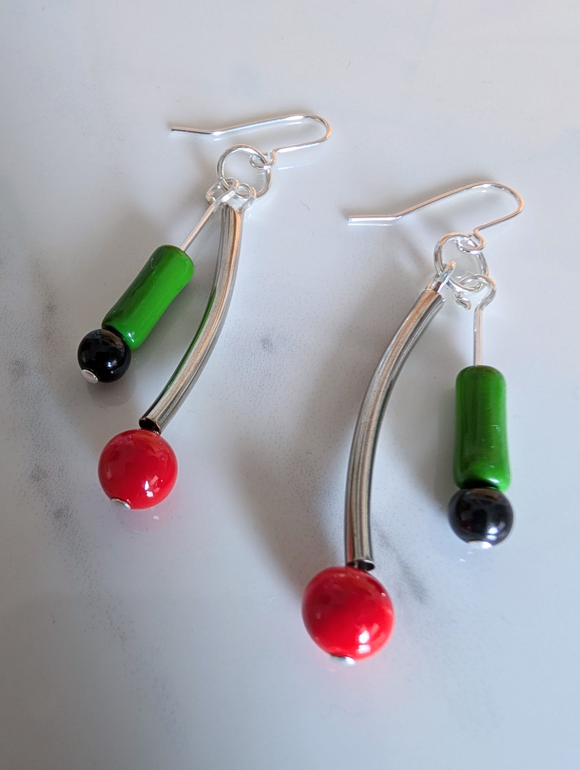 Fun modernist-style colour-pop earrings made with a curved stainless steel metal tube and three vintage green, red and black beads, with new gold-plated wires.