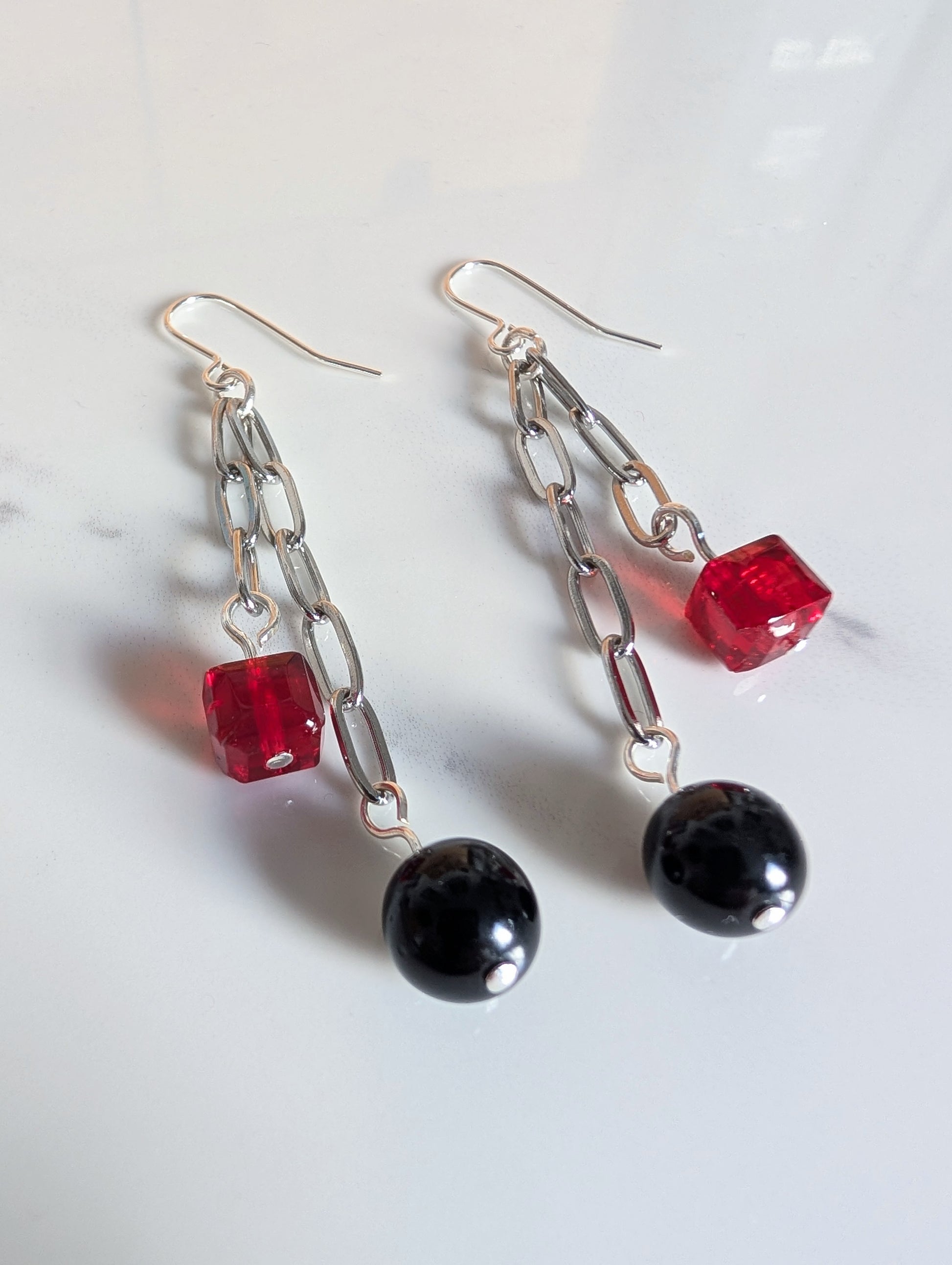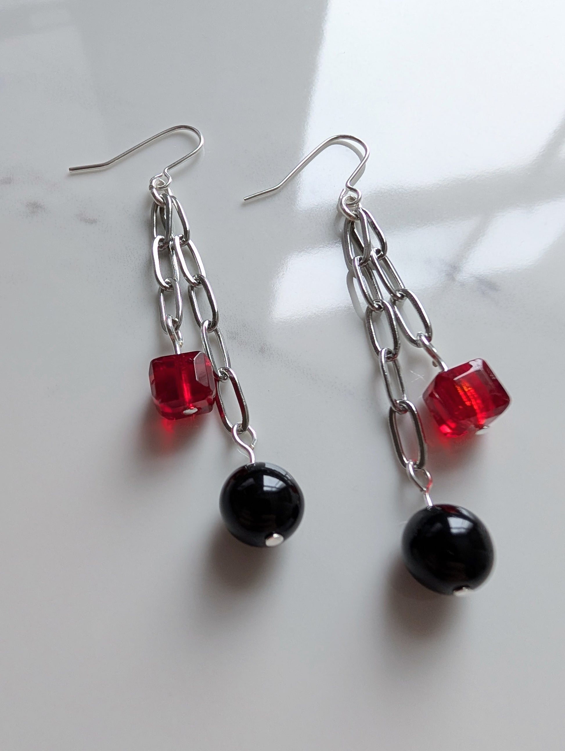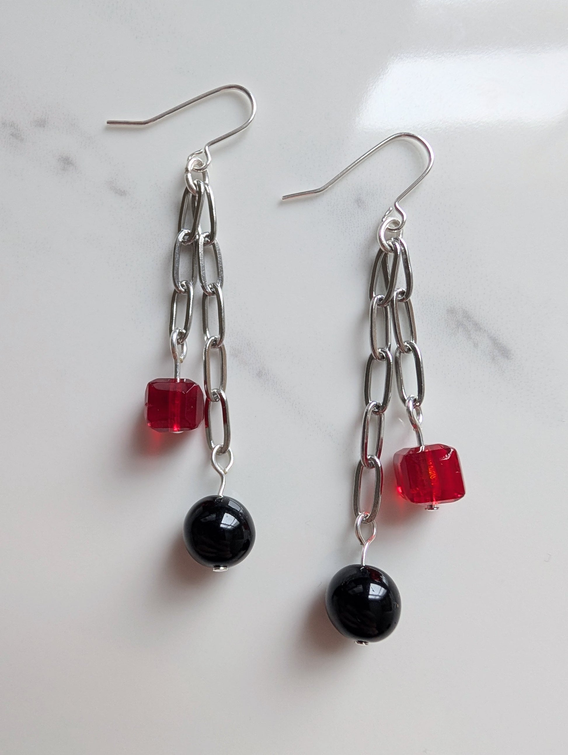 Eye-catching and lightweight earrings made with two vintage glass beads in black and red on new silver tone oval 'paperclip' chains, with new silver-plated wires.